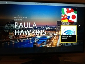 The TV in our hotel room greets us by name, and provides a personal wifi bubble, so that the sniffers on the iPads and our smartphones can detect the presence of wifi in our and adjacent rooms, but our room’s wifi has a unique password. The hotel lobby and bar have a less secure public wifi network, but perhaps this is a little more secure. What’s more, with an app that is provided via the TV, I can transfer content from my smartphone or tablet or laptop to the TV. If only I had some interesting content.