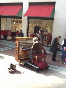 This is a crowded pedestrian shopping street, beginning at Molly Malone’s statue sure to fascinate the amercans with money who know little else of Dublin’s fair city, and winding down to St. Stephens Green, and a very Babel of languages, buskers, street people, and shoppers, pushing past stores and fast food places that would not be out of place in London or Chicago.