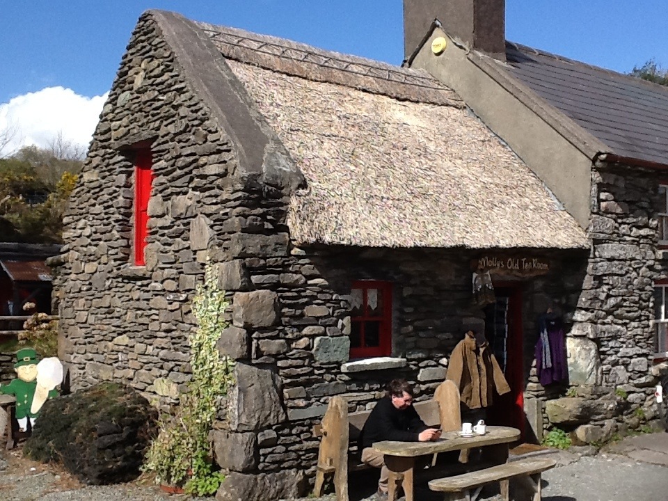 So with valuables retrieved, we proceed on our way. The stop in Sneem is a lunch stop, and the group disperses in order not to swamp any one pub. The one we choose is a combination pub and convenience store, pub on one side of the wall, convenience store on the other. As this is the area that James has pointed out as a source for ice cream in Sneem, when lunch is over, some of the small group go next door to look at ice cream, and it’s soft serve out of a machine. One of outr group of four goes for the ice creeam, and it’s not until we get outside again that we see the store across the road offering home-made ice cream. Oh, well. There is talk about good ice cream at the next stop, at Mary Galligan’s farm, which is a shop and bathroom break.