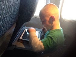 Settled into the three hour plus flight, we each turn to our respective tablets. Baron has his own family Samsung tablet, and Angry Birds seems to keep him satisfied and amused once the ground and clouds are far below and the endless sky provides no further entertainment. Descending into San Diego should prove interesting, as the plane has to come in low over the mountains and then drop down quickly to the airport at the edge of the ocean; we expect more awesomeness.