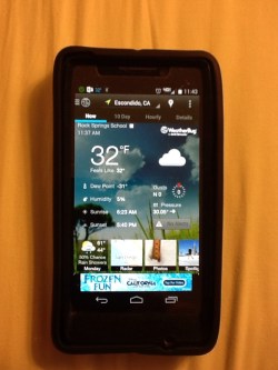 Slept in, easy day. Woke up, coffee, how’s the weather? Check Weatherbug on line. Hmm. Something wrong here. The pws (private weather station feeding Weatherbug) at the elementary school in Escondido reports exactly 32 degrees, even with a couple of browser refreshes, yet decent temperatures persist here only 10 miles away. Maybe some prankster has embedded the school weather station in ice.