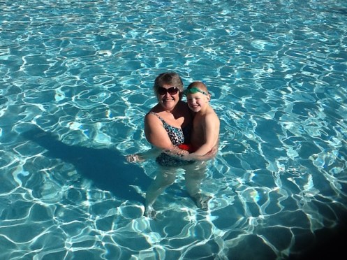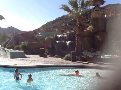 Flopped around the unit for the morning, light breakfast, and swimming in the afternoon. Low seventies and sunny with a slight breeze, so very pleasant. Baron showed no hesitation about climbing up and coming down the curvy and fast water slide, so of course Jim had to follow, and Paula took her turn, too. There’s video to prove it, but it appears that this WordPress app doesn’t countenance video, so these shots will have to do.