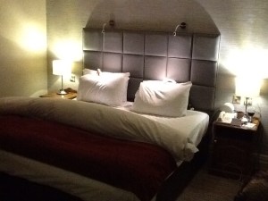 We stop for a nightcap in the hotel pub, but John heads for bed. As a result, he misses the turndown service. Weh we get to our room later, we discover the bed turned down, and chocolate bunnies on each pillow, illuminated in little spotlight reading lamps.