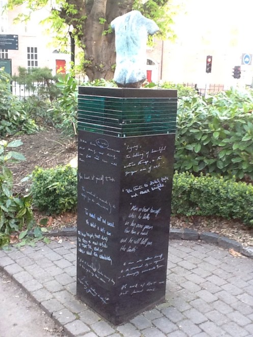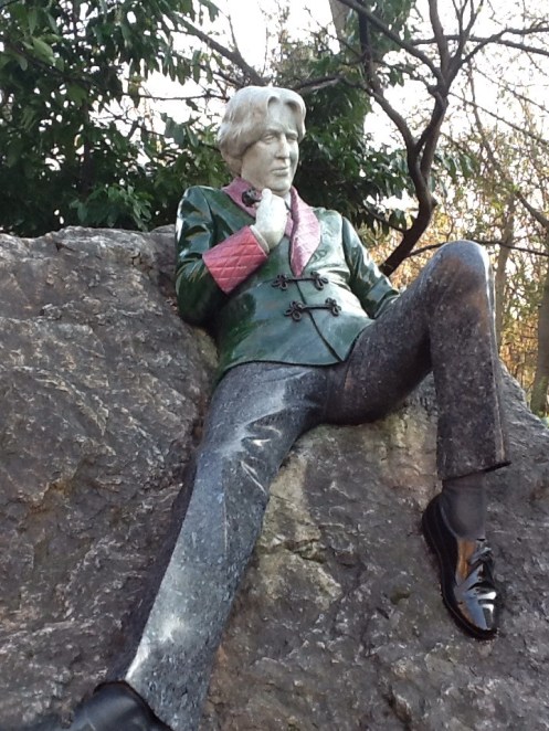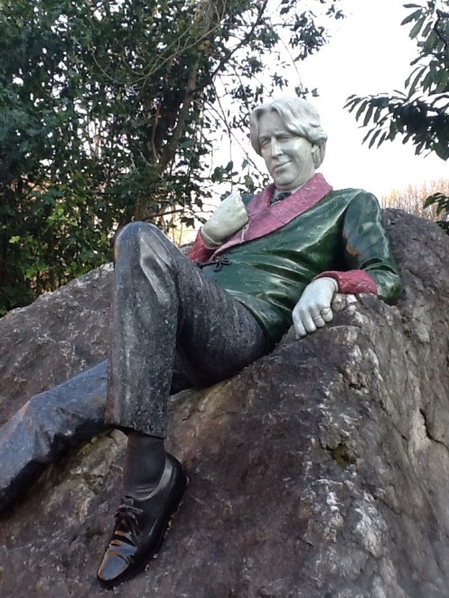 While Paula was resting her feet on Tuesday, I went off iin search of Oscar Wilde. Born Dublin kittycorner from Merrion Square, he eluded us on our last trip, because we went to the wrong park. But his statue is only a few block form the Busswell Hotel, and I am determined to see him up cclose this time. He reclines on a rock, a statue carved of three or four different kinds of stone, a sardonic smile on his face and flanked by two pillars inscribed with some of his epigrams. The university in Wausau will be presenting his play, The Importance of Being Earnest, when we return, and a picture of the statue might interest the director professor.