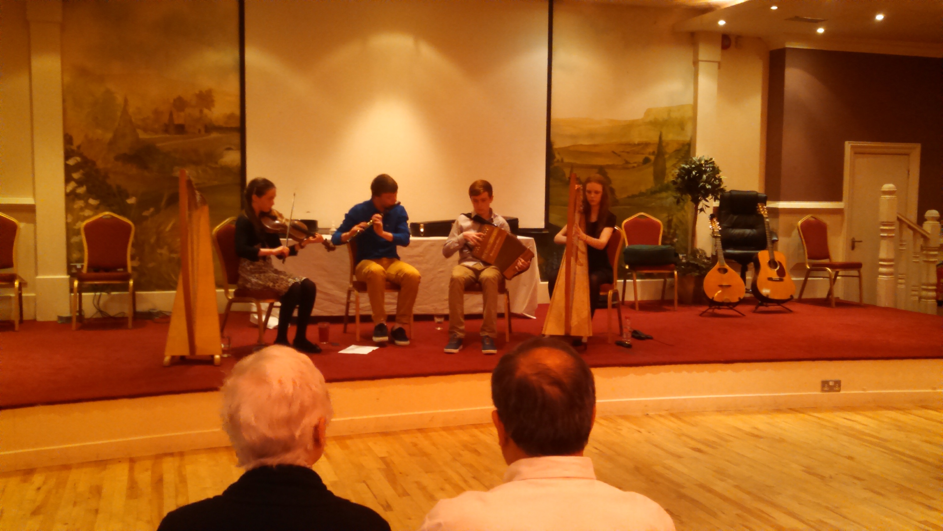 The evening concert with the four kids turns out to be with four virtuosi, two girls 11 and 15 who play Celtic harp and fiddle, and two boys 15 and 17, who are competition winners on button box, penny whistle, bohdran, and fiddle. An unscheduled concert turns into one of the tour’s highlights.