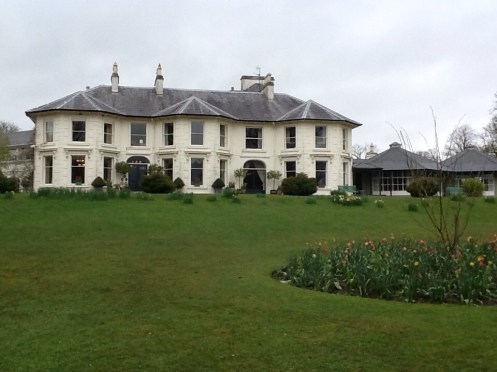Our bus pulls in cautiously through a narrow gate into a park and drives up to the front door. Cheers and applause for Martin, our bus driver (in front of the bus) for negotiating this and other tight spots.