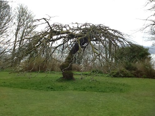 As stated elsewhere, Rathmullan is not a bustling metropolis, owing most of its fame to a historical departure. It has three churches – Catholic, Church of Ireland, and ruined. It has a vacant lot, formerly occupied by a hotel in one of whose rooms the hymn All Things Bright and Beautiful, All Creatures Great and Small was written. It has a pier that used to be a ferry landing, and a statue commemorating the Flight of the Earls. All this is revealed to us on a little walking tour by Deirdre, a local tour guide, during a blustery walkabout. Rathmullan House has an interesting elm tree, a result of grafting a branch of a mutation found in Scotland that only grows laterally onto a regular elm trunk.