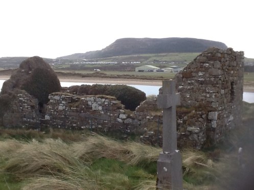 Strandhill seems to be a popular beach community, with a couple of trailer and RV parks along the shore. It features summertime activities, including a music festival and a Warrior’s Run up Knocknarea and back, and surfing. The walk goes over the dunes along the shore out to a church ruin and graveyard, across from Coney Island, once inhabited by many families and rabbits (coneys) but now just rabbits. It is said that a ship captain from Sligo named the Coney Island off Brooklyn New York after this Coney Island due to the high rabbit population. At our furthest point on the walk a squall hits and we find ourselves walking back to the bus in rain and sleet and wind that abate in favor of sun by the time we get back to the assembly point.