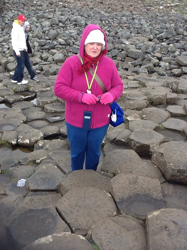The weather was blustery, and walking around on top of the pillars is an exercise in caution. Some areas are dry, and some are wet, and the individual pillars are different levels varying by inches, so it’s very much a matter of planning your route as you proceed. The visitor center is large and architecturally interesting. The audiovisual presentation area has benches to sit on and big pillows on the floor for young kids to flop on, and of course there’s a tea room café and gift shop. I was rather intrigued by some history books, but the currency in Northern Ireland is sterling, not Euros, which was what I had in my wallet. Besides, I can get that book on our Kindle for about six bucks.