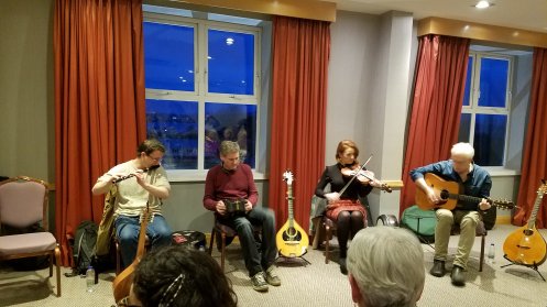 After dinner we have a one-hour concert in one of the hotel meeting rooms. James and Donnie are joined by their longtime friends Joe, Roddy, Seamus, and Theresa for a session before they all head out to the music locales for sessions in the pubs. An Irish session or seisiún is an informal, round-robin musical gathering for instrumental or vocal tunes, frequently in a pub.